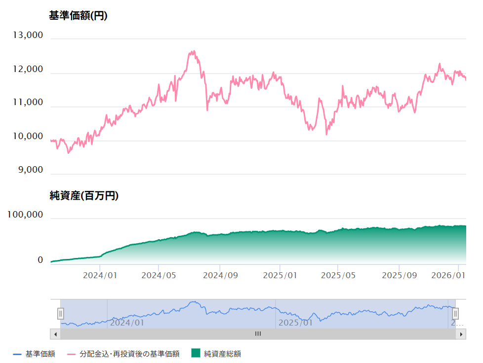 特に2026年に入ってからは、基準価額の伸びが鈍化し、調整局面に入った印象を受けます。