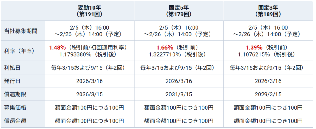 以下はSBI証券の個人向け国債の発行条件です。