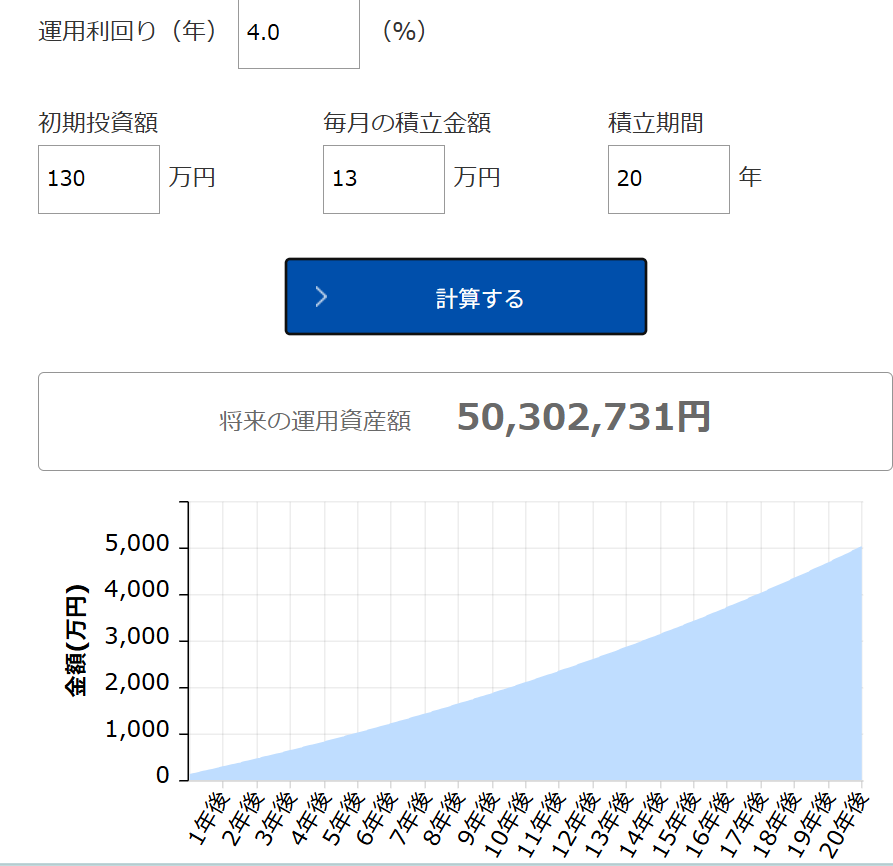 この条件では、約20年で総資産5,000万円に到達する想定となります。