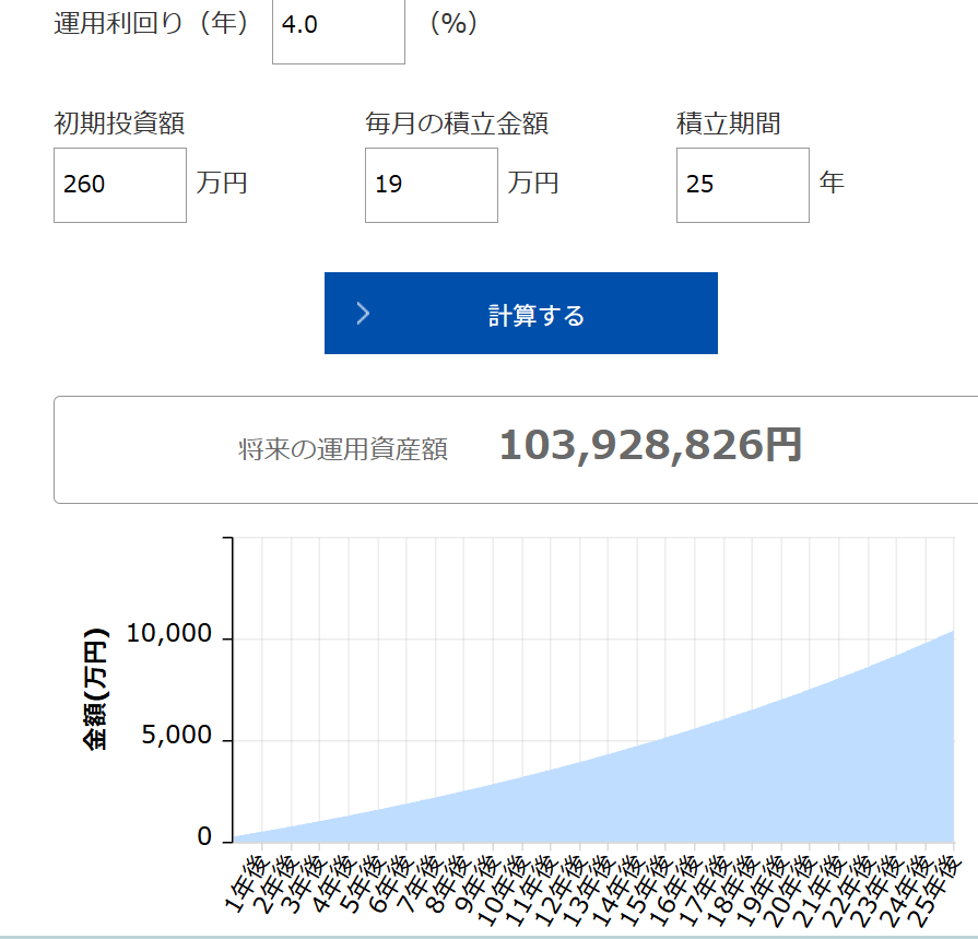 この条件では、約25年で総資産1億円に到達する想定となります。